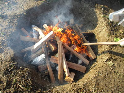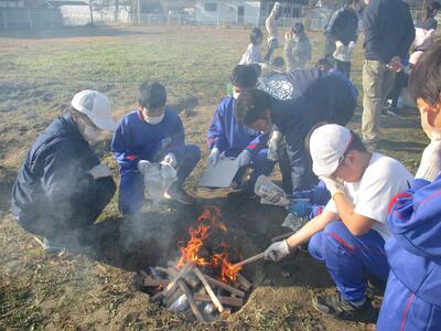 悪戦苦闘しながらも、みんなで火を守りました。薪を持ってくる人、くべる人、あおぐ人、焼き芋作りで協力することも学びます。