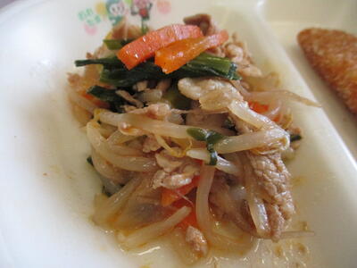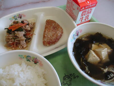 2023年5月10日 12時30分5月10日 今日の給食のメニューは、「ボロニアカツ」「野菜のプルコギ」「わかめスープ」でした。