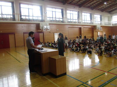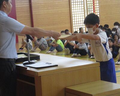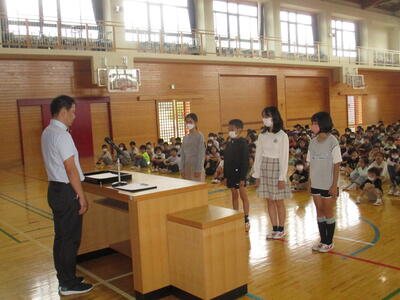 続いて、安達地区小学校理科作品展の賞状授与です。4年生男子の作品が、その着眼点を評価されアイディア賞を受賞しました。おめでとうございます。