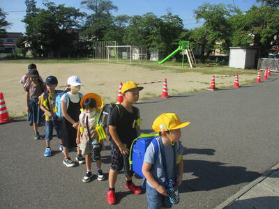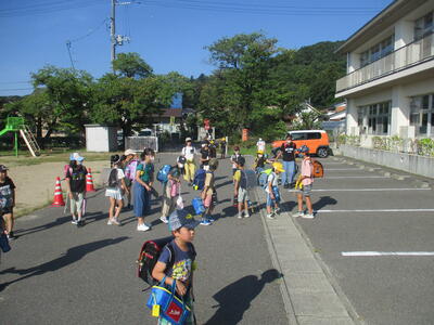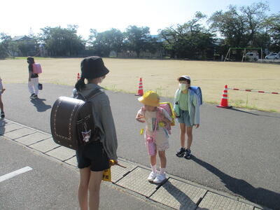 この暑さの中、班長さんを先頭にして、子どもたちが汗だくになって登校してきました。