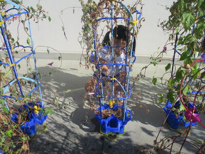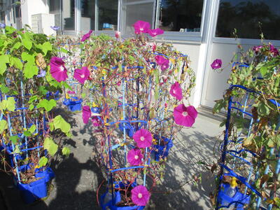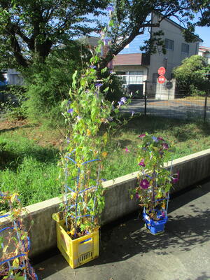 ひときわ高く伸び続けるアサガオもありました。夏休み家に持ち帰った際、ご家族の方が支えを取り付けてくださったのでしょう。その支えに安心するかのようにツルを伸ばしていました。