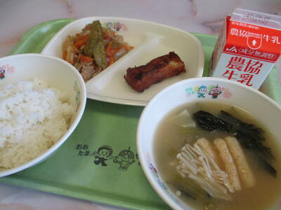 8月25日 今日の給食のメニューは「イカの竜田揚げ」「野菜と豚肉の黒酢炒め」「小松菜のみそ汁」でした。