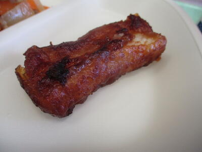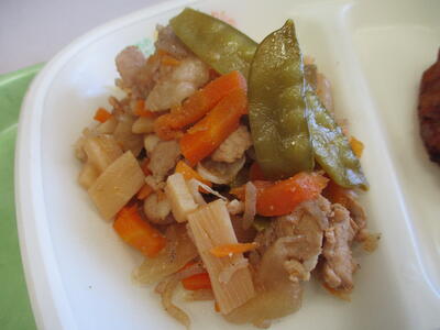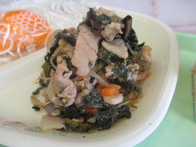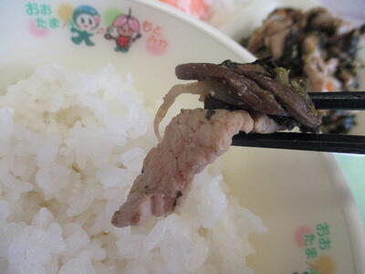 黒酢炒めは、一口ほおばるたびに、ほんのりとした酸味が口の中に広がります。2学期が始まって4日目、厳しい暑さも続いていて、疲れがたまる時期です。酢には疲労物質である乳酸を分解し、蓄積を防ぐ効果があります。また、食べ物を効率よくエネルギーに変えることで疲労の回復も早くなります。この時期にぴったりのメニューですね。