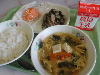 8月28日 今日の給食のメニューは「牛乳」「ビビンバの具」「中華玉子スープ」「オレンジ」でした。