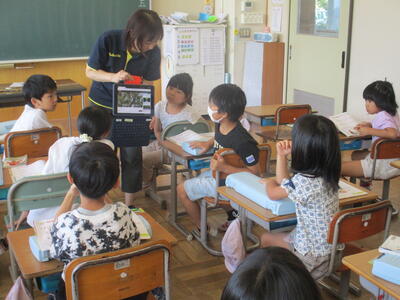 さらに、先生は歌のイメージを広げるために、タブレット端末で実際の学校の鳴き声を聞かせてくれました。ICTの使い方は多様ですね。