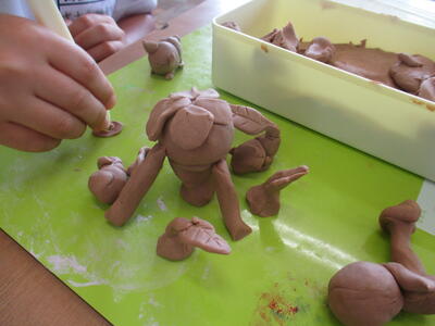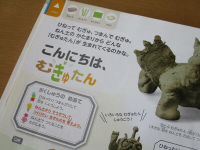 粘土をひねってむぎゅ、つまんでむぎゅ。むぎゅむぎゅを繰り返すうちに、粘土のかたまりが、自分のオリジナルな「むぎゅたん」に生まれ変わっていくのです。低学年の果てしない想像力がどんどん広がっていく題材です。