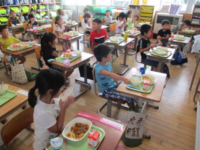 さて、これもは半ば強引なのですが、カレーライスと言えば1年生。しっかり食べているかなあと思い、教室を見にいくと…完食、完食、完食、そして完食。黄金の完食ラッシュでした。「給食のカレーライス最強説」が真実味を帯びてきました。