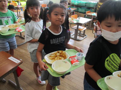 半ば強引ですが、やはり、2学期のスタートはカレーライス。テンションを上げるにはカレーライスと勝手に思っています。そのカレーライス、夏野菜がたっぷり入っていました。地元もとみやの食材もたくさん使われていて、おいしさ倍増です。