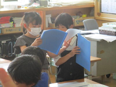 ドキドキしながら通信票を開く子どもたち。