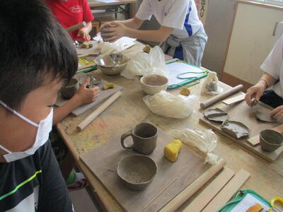 7月11日 6年生が、本宮市在住の陶芸家の方をお招きして陶芸教室を行いました。図画工作科の「工作」の学習と総合的な学習の時間の「地域のひと、もの、こと」に学ぶ学習がコラボしたよう授業でした。