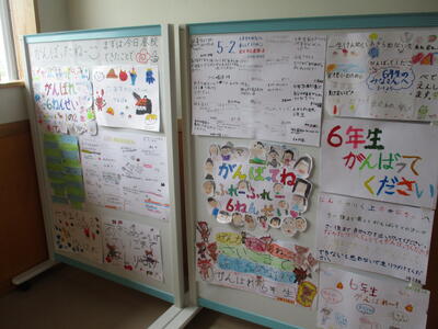 5月29日 南達方部小学校交歓陸上競技大会の熱も冷めやらぬ今日。6年生教室前には、今までの努力をねぎらうかのように、応援メッセージが再掲示されていました。