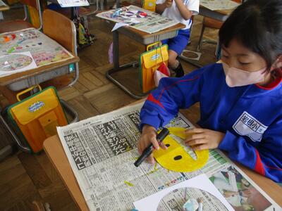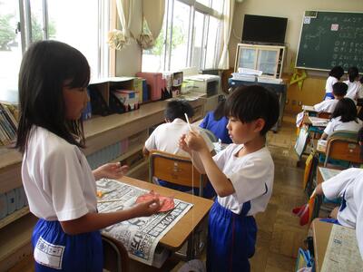 5月31日 2年生が図画工作科の学習中。オリジナルの紙けん玉をつくっていました。