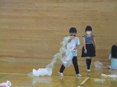 ビニール袋に空気を入れて「空気のつみ木」をつくります。そして、空気の弾力や手触り、軽さや透明感などの材料の面白さを感じ取りながら活動に取り組んでいました。