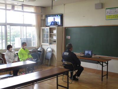 開会式はリモートで行いました。駐在所長さんから交通安全についての講話をいただきました。どの学年もしっかりと話を聞いていました。