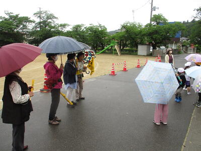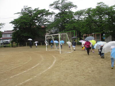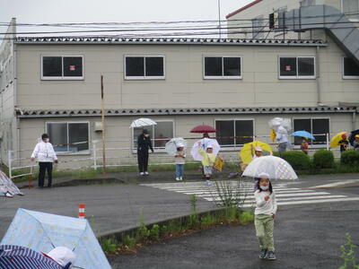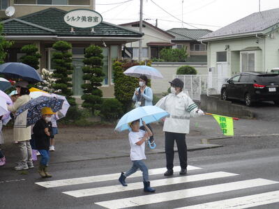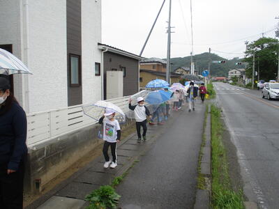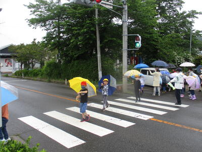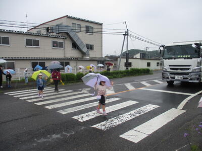 雨の日は、傘によって周囲の視界が遮られます。そのため、交通事故の危険度は高くなります。ですから、このような日こそ、練習をするにはうってつけです。子どもたちは、一列に並んで出発しました。