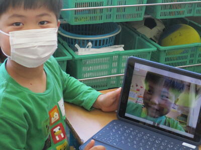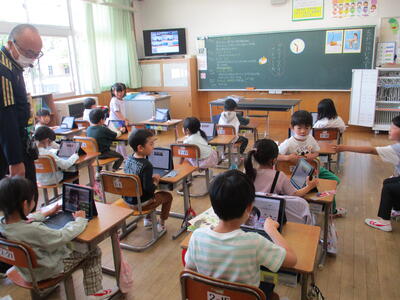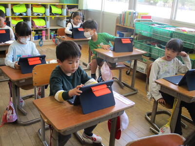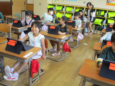 5月11日 現在、児童1人に1台のタブレット端末が配付されています。さっそく、1年生がタブレット端末に触れていました。
