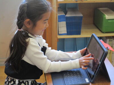 学校経営方針にも「ICTの日常的・積極的活用」と示しましたが、1年生からもどんどん取り入れ、子どもたちが操作に慣れるようにしていきます。ある意味、タブレット端末ははさみや定規と同じように一つの「文房具」と捉えています。積極的な活用が上達の近道です。