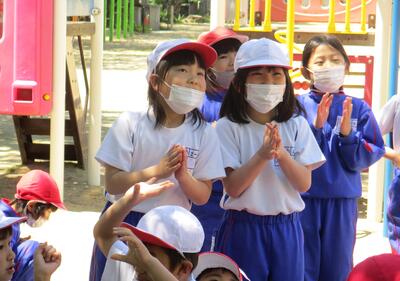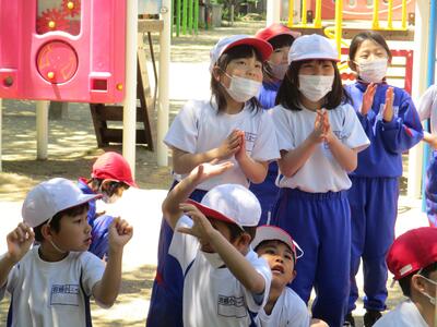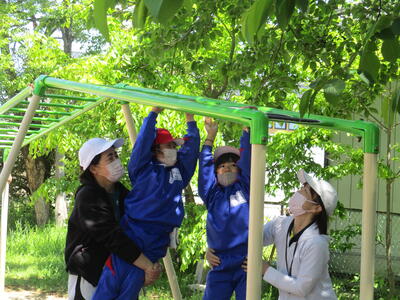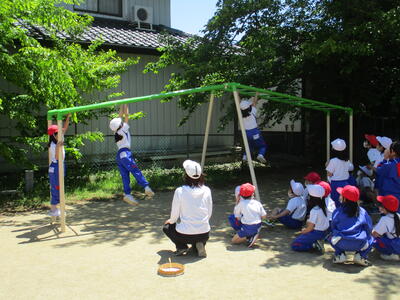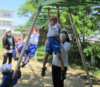 5月11日 2年生が雲梯を使った運動遊びをしていました。左右の手を交互に出していくのですが、実は、体をテンポよく左右にねじるところがポイント。まずは、得意な子たちがお手本を見せていました。