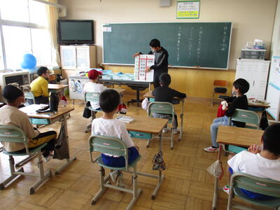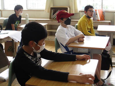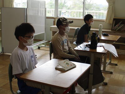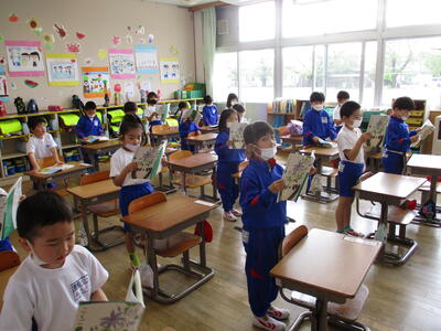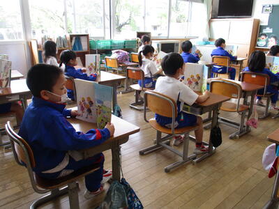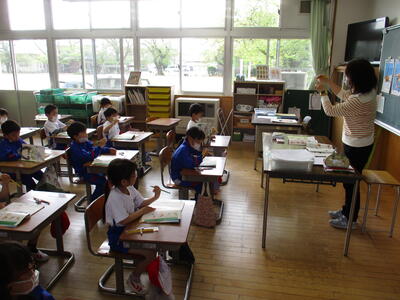 4月21日 1年生が国語科の学習中。みんなで声をそろえて音読をしていました。