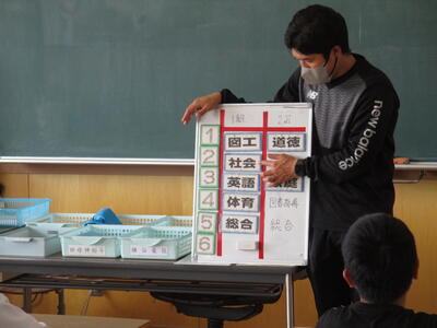 先生が一日の予定を伝えている学級がありました。言葉だけではなく、1日の予定を見せながら(文字の大きさも見やすい!)話していました。