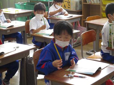 4月21日 1年生のもう一つの学級では、鉛筆の持ち方を学習していました。