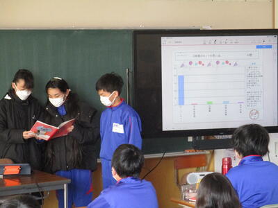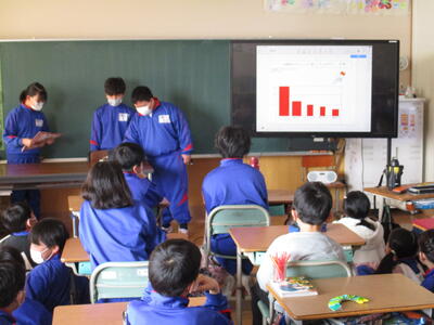3月8日 4年生が、1・2組合同で国語科の発表会。タブレット端末を活用して資料をまとめ、調査結果を伝えていました。学習発表会でも同様なスタイルで発表をしましたが、今回は「調べたことを表やグラフにまとめる」ことも学習内容に加わりました。