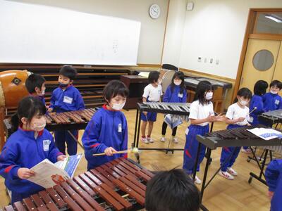 お互いに演奏を交換しながら、はじめての音楽室を楽しむ1年生でした。