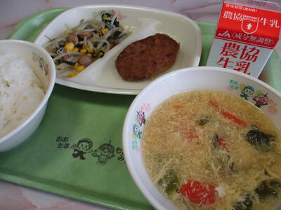 2月14日 今日の給食のメニューは「和風おろしハンバーグ」「もやしとコーンの炒めもの」「中華たまごスープ」でした。