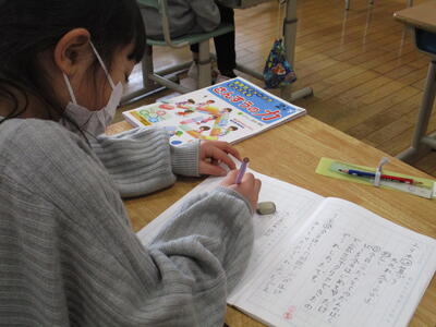早く書き終えた子は、今日の日記を書いているようです。生活科が楽しかったようですね。一日の「振り返り」も大切な学びです。また、書き言葉として「表出」することで、自分のがんばりや学習内容をより強く記憶することにもなります。