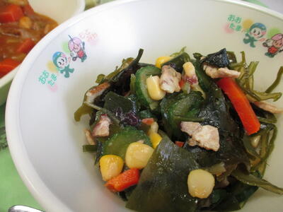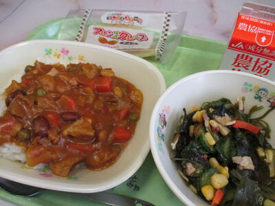2月13日 今日の給食のメニューは「ポーク&ビーンズカレー」「海藻サラダ」「チョコクレープ」でした。