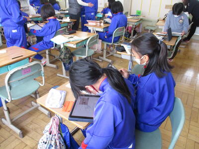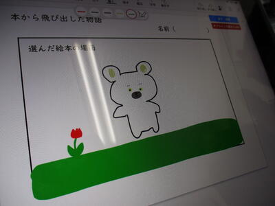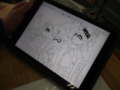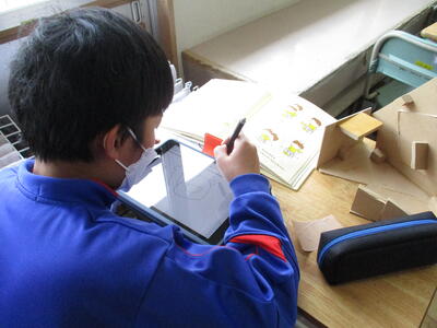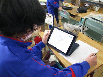 今日は、タブレット端末を使って下絵作りに取り組んでいました。タブレット端末を使うと、何度でもやり直しができますし、絵が苦手な子は参考作品を調べることもできます。こんなところでも、タブレット端末は有効に使われています。