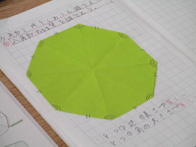 今や一人一台のタブレット端末をもつ時代ではありますが、手を使って考えるアナログな学びも図形の感覚をつかむためには欠かせない学びです。自分たちで正八角形をつくって、長さや角度を測ることで実感を伴った理解につながります。