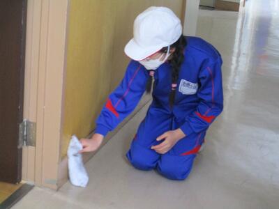 岩根っ子全員で、力と心をこめて床の汚れを落とします。