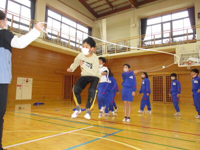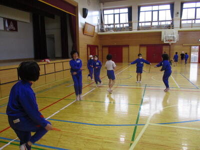 1月16日 今日から、業間の休み時間は「なわとびタイム」となりました。今日は4年生の割り当ての日。個人種目や団体種目の長なわとびの練習に励んでいました。