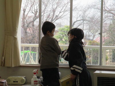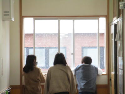 廊下でも雪を眺めている子どもたちがいました。どの学年でも、雪は気になるようです。
