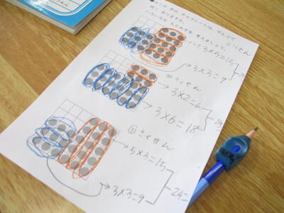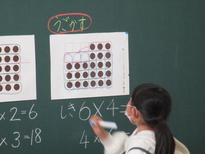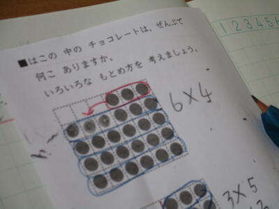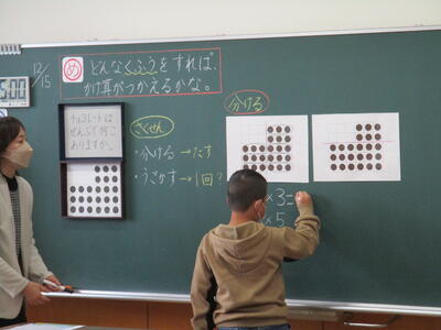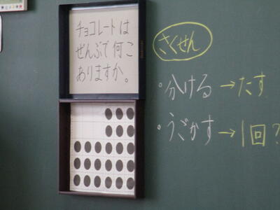 12月15日 2年生が算数科の学習中。かけ算を使って、チョコレートの数の求め方を考えていました。