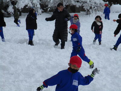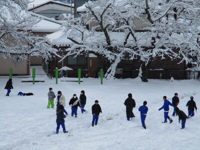 12月19日 昨日から雪が降り続け、今日は学校も一面の銀世界となりました。雪が積もれば…そう、思い切り雪遊びをしたくなるのが子どもの常というものです。今も昔も変わりはありませんね。休み時間になると、子どもたちが一斉に校庭に飛び出してきました。