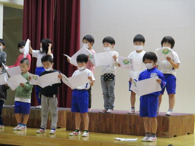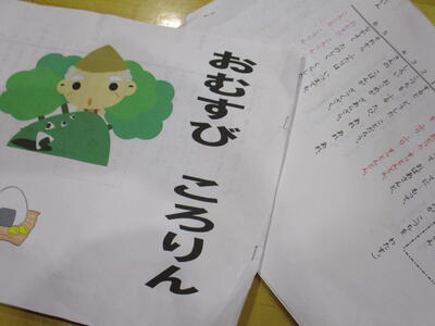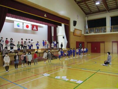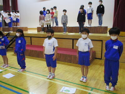 体育館では、1年生がステージを使って練習を頑張っていました。「おむすび ころりん」を大きな声で、はっきりと音読してました。