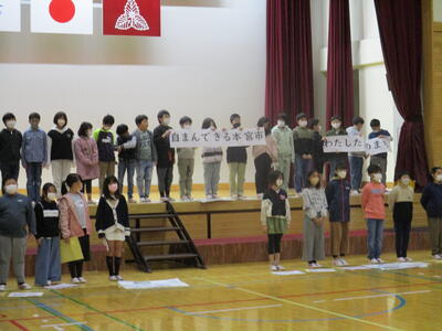 4年生は丁寧に作られた発表資料をもとに、私たちのふるさと本宮市についての発表をしていました。各班とも、どうすればもっと聞いている人に分かりやすく伝えられるか真剣に考えていました。