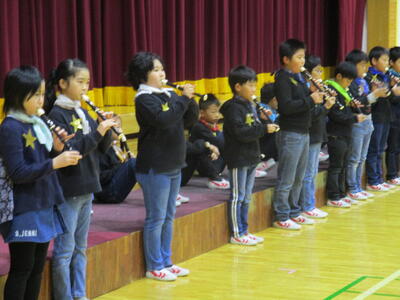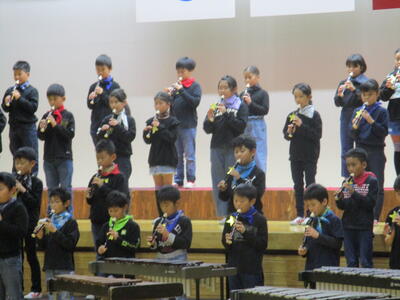 トップバッターは3年生です。3年生になって出会ったはじめてのリコーダー。指の使い方に苦戦した子もいましたが、何度も練習を繰り返し、今ではたくさんの曲が演奏できるようになりました。