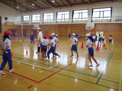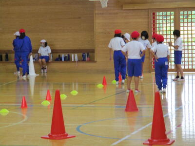 体育館のもう半分では、5年生がサッカーをがんばっていました。外は雨がぱらついていたので、本日フットサルです。スペースはせまいのですが、そこは考えようです。ぶつからないように動こうとすれば、俊敏性も高まります。