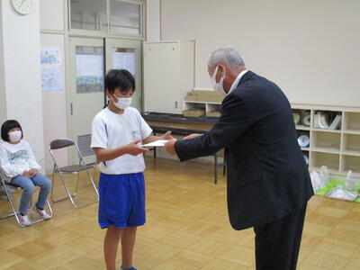 はじめに、学校運営協議会主催の「第2回防犯標語・交通安全啓発標語」の表彰が行われました。今回、学校運営協議会長さんをお招きして、直接、表彰をしていただきました。