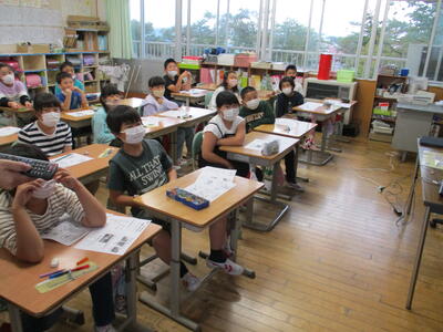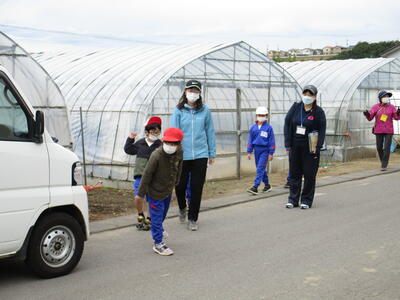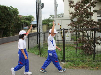 2年生は、班ごとに学校周辺の道を歩きました。生活科「まちたんけん」の学習で身に付けた、安全な道路の歩き方を生かしていました。途中、道路に車が停まっていたのですが、先生の指導が秀逸でした。