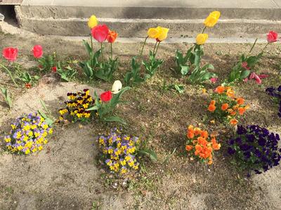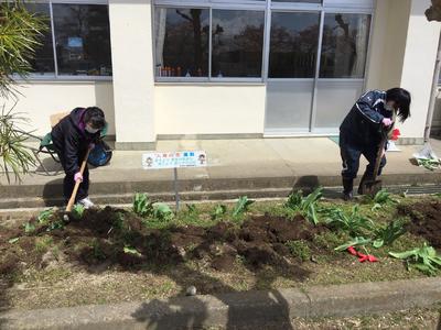 先生方が皆さんの登校に向けて、花壇の手入れや畑を耕す作業をしています。