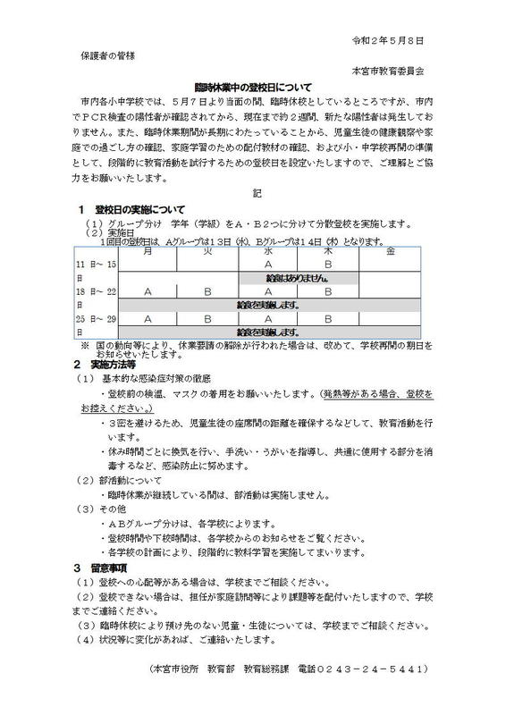 先ほど連絡メールでもお知らせしましたが、臨時休業中の登校日についてHPでも再度お知らせいたします。