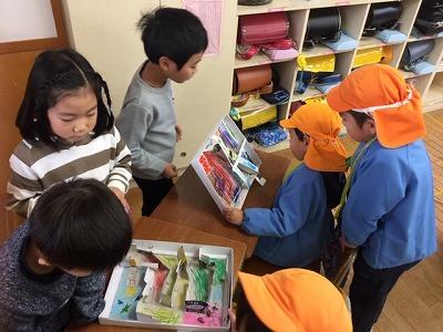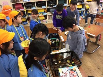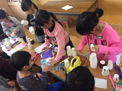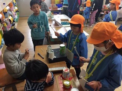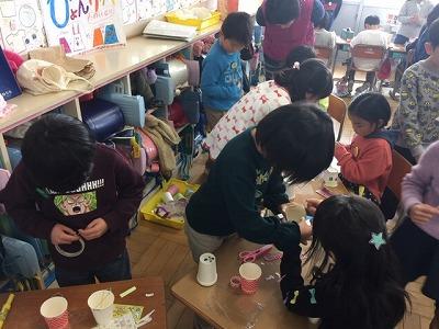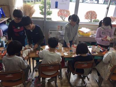 魚つり,ぴょんうさぎ,びっくり箱,ぱっちんガエルなど,楽しいおもちゃの作り方を2年生が1年生に教えてあげながら一緒に遊ぶのです。