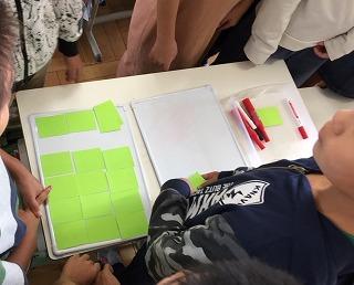 長方形の紙を同じ向きにすきまなくしきつめて、一番小さい正方形をつくるという課題でした。