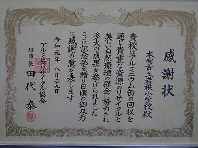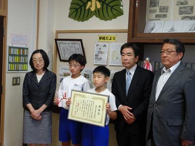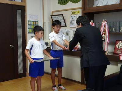 10月4日(金)、アルミ缶リサイクル協会の小林裕様、陣野商店の陳野重直様・陳野重頼様が来校し、校長室で「アルミ缶小中学校回収協力者表彰式」が行われました。本校の40年以上に渡る資源回収活動は評価に値するものだと、陣野商店様からの推薦を受けて表彰されました。