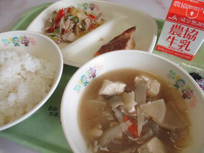 2月7日 今日の給食のメニューは「赤魚の漬け焼き」「彩り野菜の炒め物」「ごまけんちん汁」「しそひじき」でした。