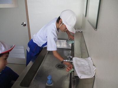 4年生が、1年生の雑巾を絞っていました。実際に絞るところを見せながら教えていたのです。
